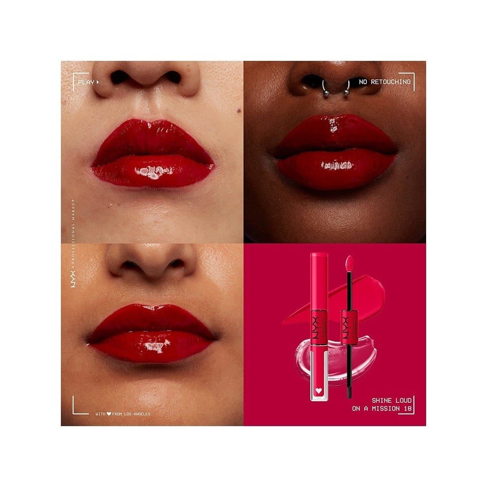 احمر شفاهأحمر شفاه إن إكس واي شاين لاود بلمعة فائقة، درجة 18 أون إيه ميشن لإطلالة جذابة تدوم طويلاً.