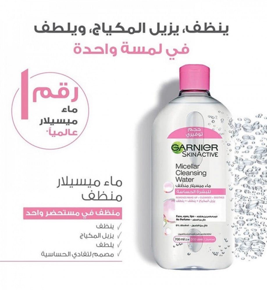 نظفي بشرتك بعمق ورفق مع غارنييه ماء ميسيلار؛ الحل المثالي لإزالة المكياج والشوائب بلمسة واحدة لبشرة ناعمة ومنتعشة.